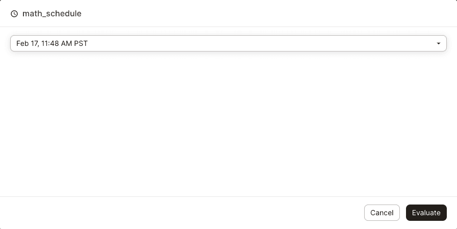 You'll be prompted to select a mock schedule evaluation time. As schedules are defined on a cadence, the evaluation times provided in the dropdown are past and future times along that cadence.